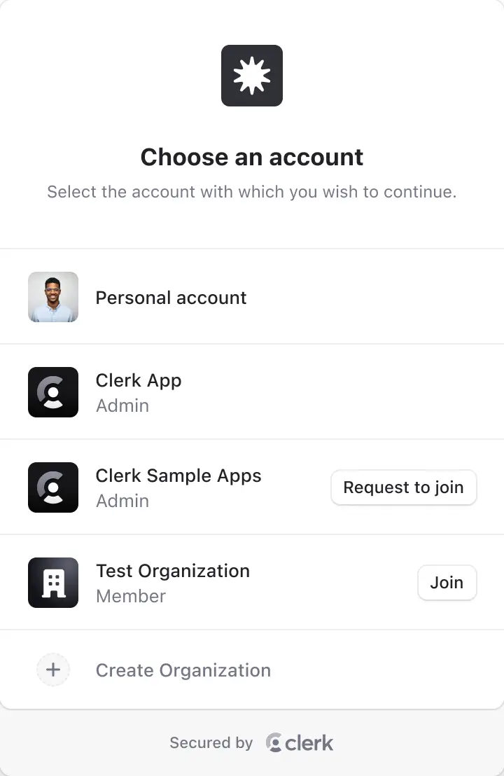 Clerk organization list component showing a list of available organizations, with buttons to create a new organization or join an existing organization.