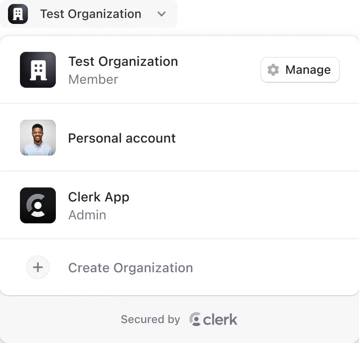 Clerk organization switcher component expanded to display a list of available organizations and a button to create a new organization.