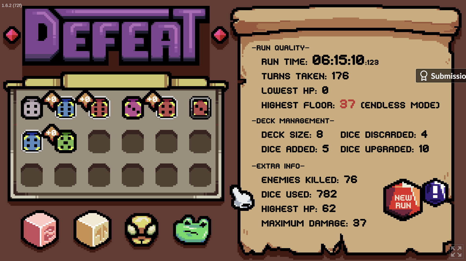 Once you're there, the difficulty increases by providing flat bonuses to all of the opponent's numbers. Encounters don't seem to be designed with this in mind. You'll quickly be facing things like two flies that are doing 5x5x2 (ie 50) damage a round, backed by a Mothman healing 2x7ish damage a round. You only ever have a die pool of five dice to play. Assuming max pips, that's 30 points of whatever on your first round. At this point if you spend less than the majority of your dice on (perfect) attacks, any damage you deal will be healed. If you spend it exclusively on defense, you'll only soak about half of the damage. Even with specialty dice that get stronger over time the acceleration of how bad that early fight curb stomp is makes long term survival impossible. Perfectly optimal plan is still beholden to RNG, which statistically speaking -will- pull a cheap shot. And then it's back to that half hour introduction before you can play the challenging part again.
