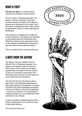 The Baron’s Sport is adapted from the #VALLEY100, a 100-person gauntlet I ran entirely over Bluesky posts in February 2025. Some of the rooms in the original gauntlet have not made it into this version, as they are unsuited to funnel play, but a select few have and exist in these pages as more fleshed out reincarnations.