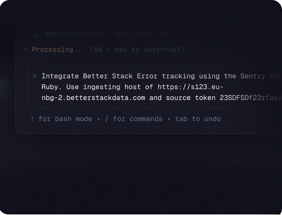 Integrate Better Stack in seconds with a single prompt. Copy, run, and start tracking errors with Better Stack.