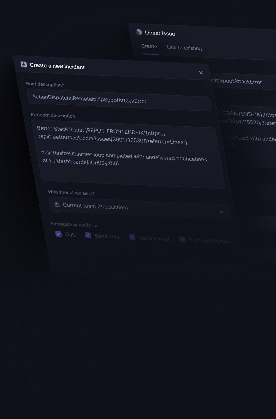 Connect Linear or Jira and create tickets with the necessary context. Critical issue? Escalate an incident to your on-call person.