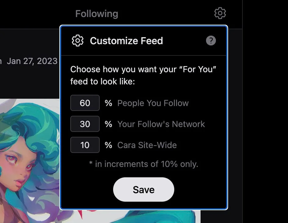 Curious about Cara? We’re a platform with portfolio and social feed. We have AI detection that filters out AI images from portfolios, customizable home feed, and album options for portfolios.