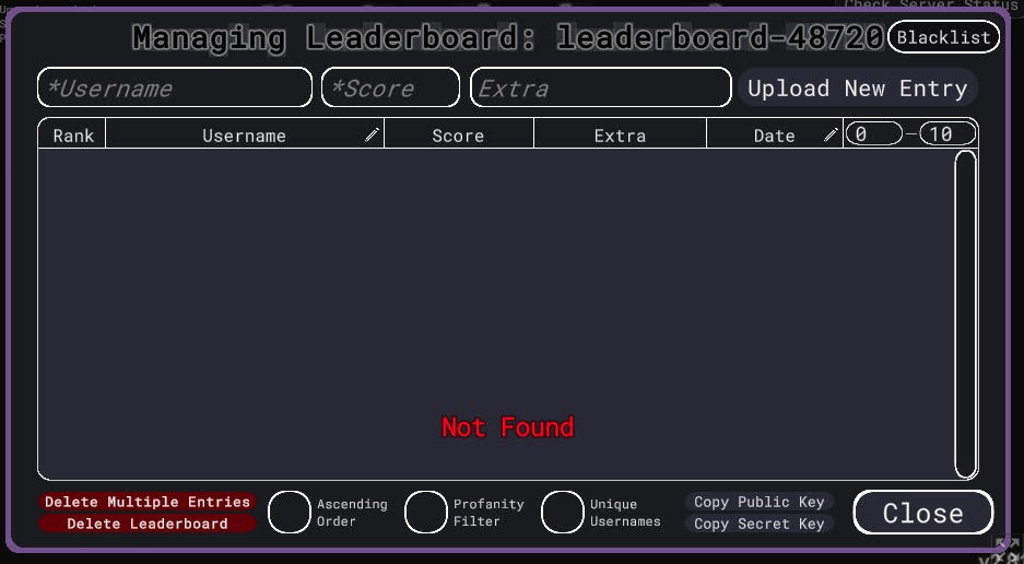 The page here doesn't allow me to actually view or manage the leaderboard. I can use the leaderboard in the game, but when I come here to manage it, it says not found.![]()