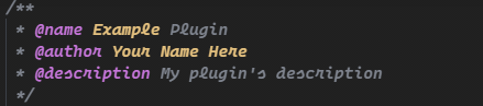 In this plugin.js file add a comment block to the top of your file in this format, and fill in the information: