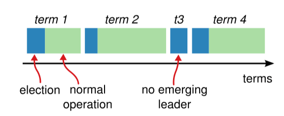 如图 3 所示,raft 算法将时间划分为任意长度的任期(term),任期用连续的数字表示,看作当前 term 号。每一个任期的开始都是一次选举,在选举开始时,一个或多个 Candidate 会尝试成为 Leader。如果一个 Candidate 赢得了选举,它就会在该任期内担任 Leader。如果没有选出 Leader,将会开启另一个任期,并立刻开始下一次选举。raft 算法保证在给定的一个任期最少要有一个 Leader。
