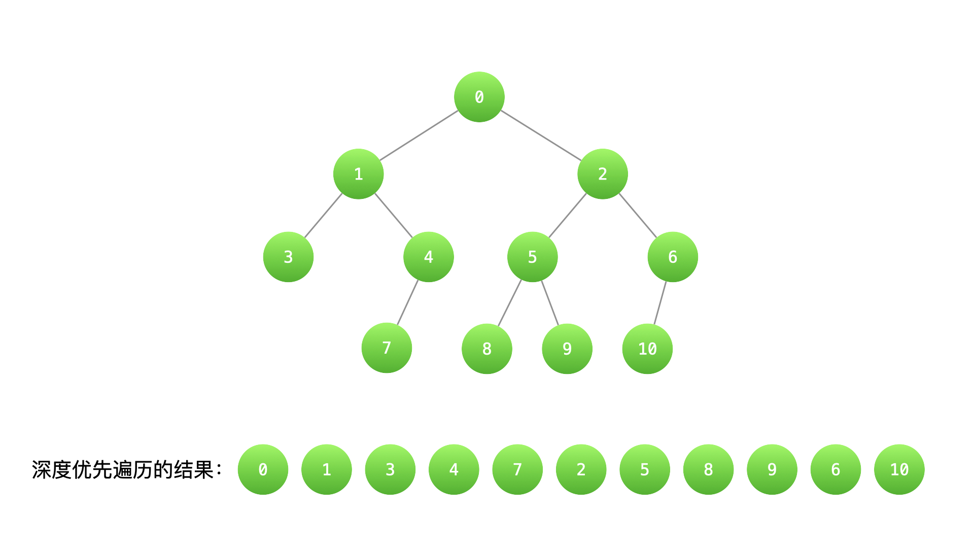 对于任意一棵子树,先输出根结点,再递归输出左子树的 所有 结点、最后递归输出右子树的 所有 结点。上图前序遍历的结果就是深度优先遍历的结果:[0、1、3、4、7、2、5、8、9、6、10]。
