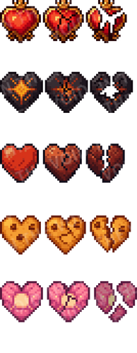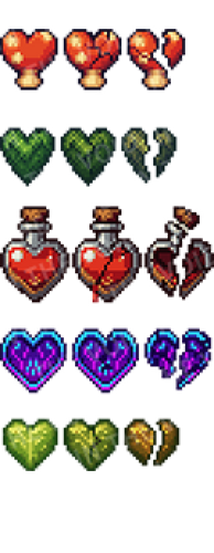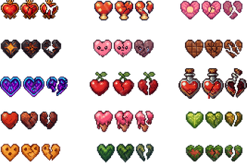 This is a pack which contains 45 + 15 unique Pixel Art Heart Icons in various stunning styles, perfect for your game's health system, UI, or any creative project.
