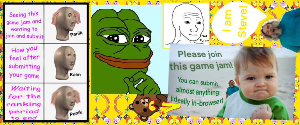 Try to stay within the spirit of a game jam, but premade assets are allowed. Make as much as you can, but use whatever you want, put some old memes in the game! Maybe finish a scrapped project because the scope was too small and just add memes, jokes and make it funnier.