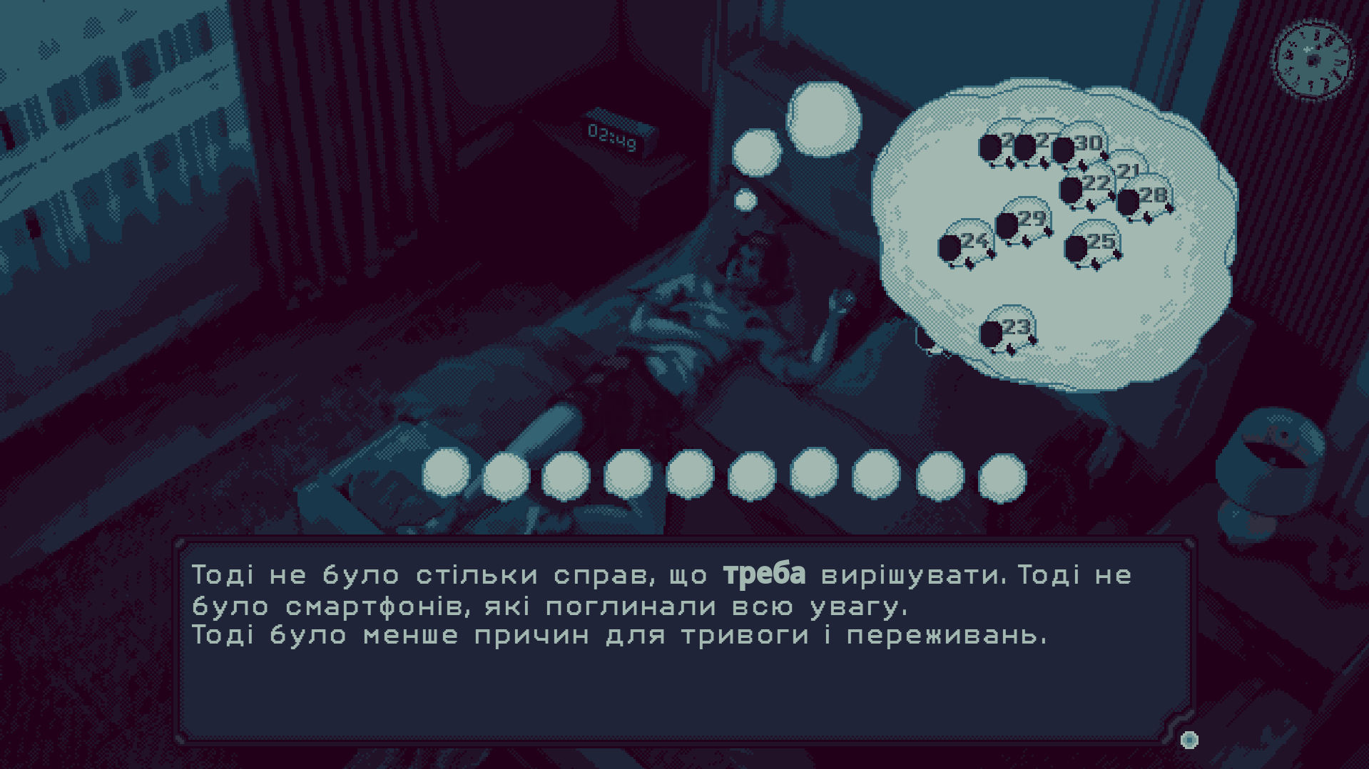 музика теж дуже атмосферна, разом з візуалом так взагалі внорюєшься до ностальгічного світу старих ігор (і так, це пише Gen Z 😅). але цілу добу було дуже важко читати через маленький текст – його точно треба збільшити!
