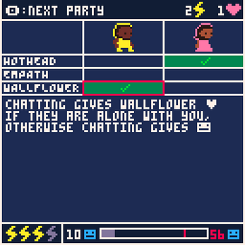 It's a good touch (and a challenge), too, that I'd often forget about keeping track of the party's vibes - by the time I would realize we were on the verge of a Bad Time the door was often too far away for me to leave in time. Reminded me a lot of trying and failing to extricate myself from a house party on its dying legs in my 20s.