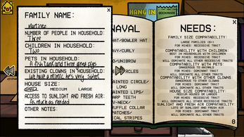 Very fun, but I wish the feedback for incorrect placements was a bit clearer? ended up having smiley brought in 3 times, and boss wendy and princess twice, and I'm not sure what I did wrong? also I find the lighting requirement confusing, like if a household says yes to lighting does that mean its unsuitable for a clown that prefers shade? it would also be nice to know what breeds are suitable for the reservations, and I'm still kinda confused on when/when not to send clowns to the zoo or reservation. so far I've just sent every nightmare clown to the zoo