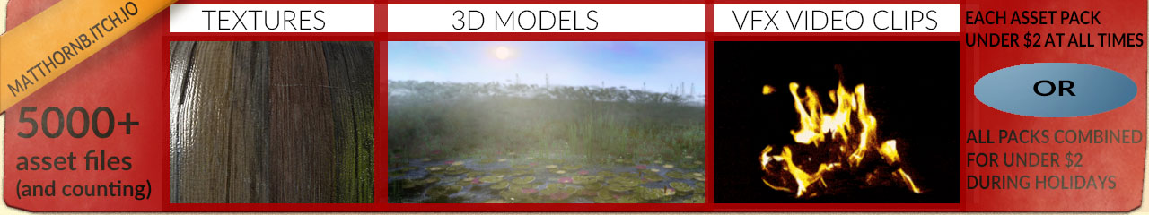 This is a collection of asset packs - 3d models, seamless PBR textures, video VFX elements... all sorts of stuff useful to creative people! This content may yet end up on other bigger storefronts, maybe Fab, Unity Asset Store, Turbosquid...