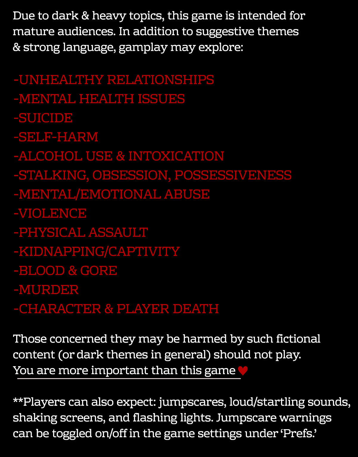 -HORRIFIC & HEARTWARMING: A blend of existential and psychological horror with slice of life elements for an experience that may be creepy, comfy, or both.