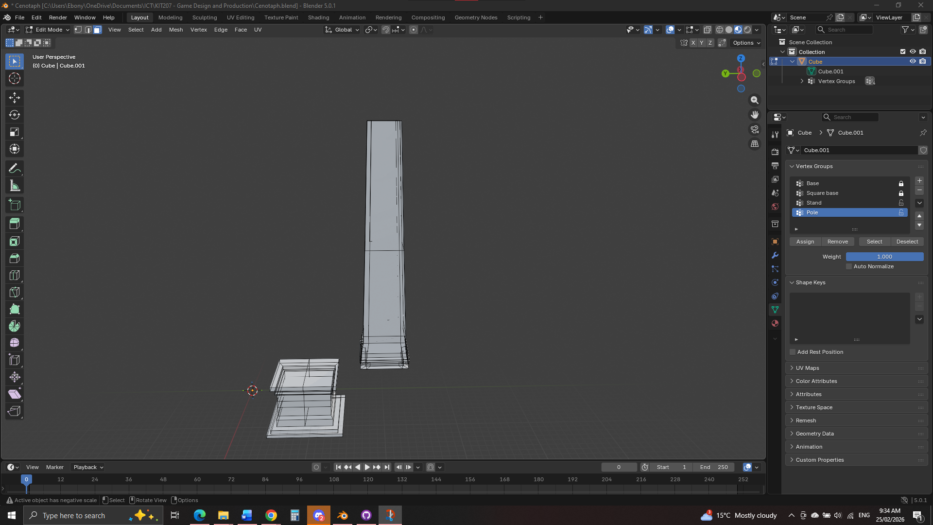 Unfortunately, I initially couldn’t apply textures to the Cenotaph and could only fill it with a single colour. With help from Ian and another student, I discovered that the issue was caused by the faces being flipped inside out. This became clear when I imported the model into Unity and noticed that some faces were missing entirely. Once I understood the problem, it made much more sense and was a valuable learning experience. I was able to fix it with the guide of this YouTube video: (73) Flipping & Recalculating Normals In Blender! - YouTube