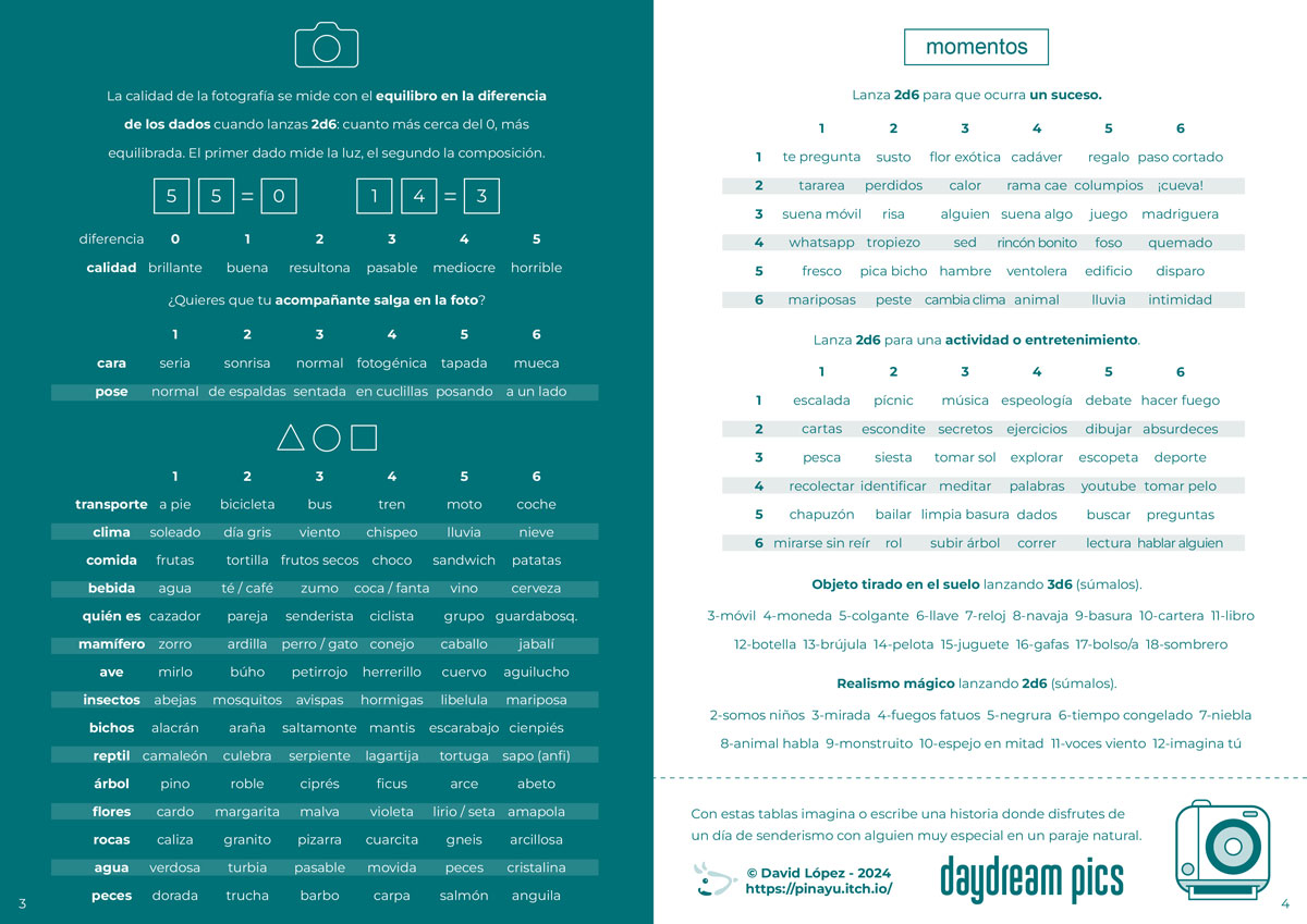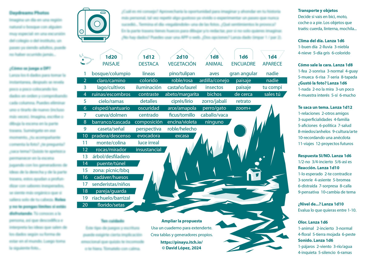 | Tags | Cozy, GM-Less, journaling, nature, nostalgia, One-page, photography, Slice Of Life, Solo RPG, Tabletop role-playing game |