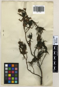 leaves linear-lanceolate, subulate, acuminate, pinnatifido-dentate, the teeth filiform, glandularly ciliate; flowers racemose; pedicels longer than the bract; sepals lanceolate. acuminate, glandular at the margin, as long as the obtuse petals. The whole plant viscid. Stem shrubby, 3–6 feet high, branches and ramuli brownish, glabrous. Leaves crowded at the end of the branchlets, one nerved, ciliate with long and short hairs, and pinnatifid with patent ciliæform, 2–3 lineal subulate teeth, black when dry, 2–2 1/2 inches long, 1 1/2–2 lines wide at base. Racemes ending the branchlets, villous, 4–6 flowered; pedicels 6–12 lines long, bibracteolate in the middle, and subtended by a leafy bractea of their own length or shorter. Sepals from an ovato-lanceolate base subulate, acuminate. Petals oval, pale rosy or white. Anthers oblong. Capsule valves ovate.