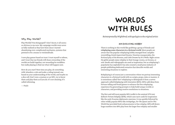 Inside you will find assorted wisdom and views on the the practice of tabletop RPGs from those who have stepped into the Play Worlds mindset.
