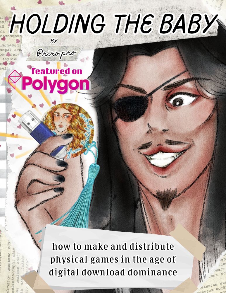 HOLDING THE BABY: How to Make and Distribute Physical Games in the Age of Digital Download Dominance is your guide to escaping digital-only games distribution and creating a more tactile and personal experience with your precious creations. In it, you will find information on how to acquire, design, distribute, display, and enjoy physical copies of your games, even on a shoestring budget. Just like you held your favorite childhood game at your local game store so long ago, you can hold a game you're proud of!