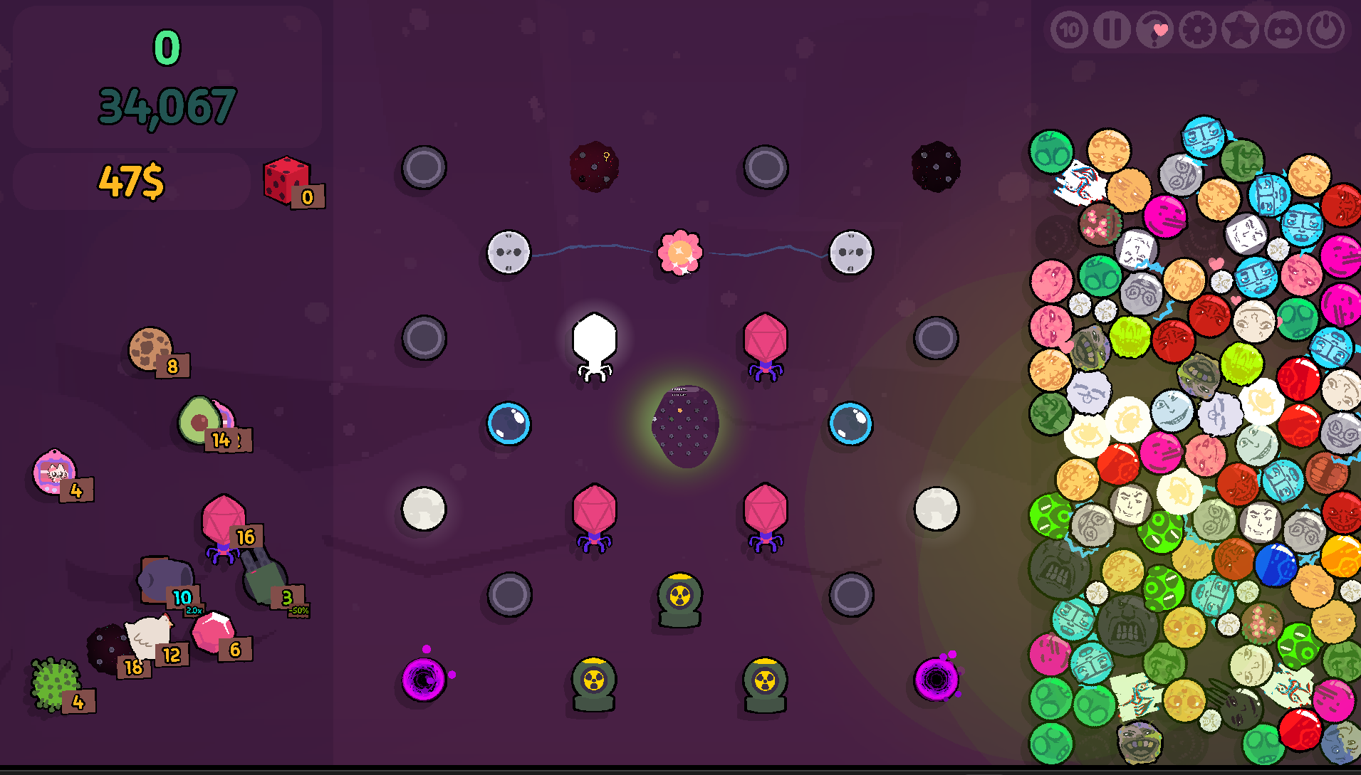 Some feedback: the stats don't reset between rounds. For instance it still shows stats for the mouth and coin pegs even though I haven't used those this round. But maybe is intended.