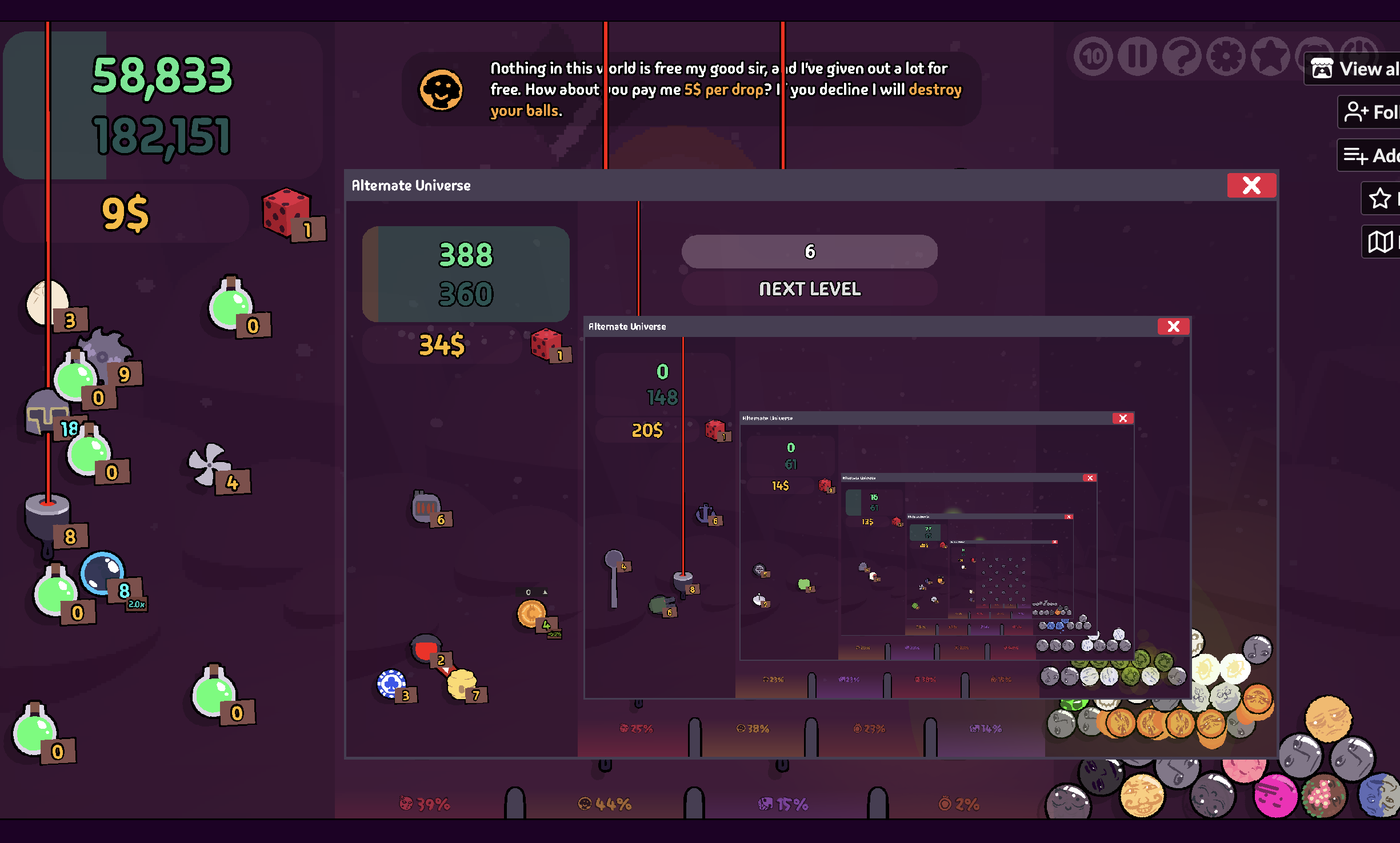 really fun game but unfortunately I keep breaking the game. There needs to be a button to force end the current drop. Destroying the balls doesn't work all the time.
