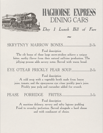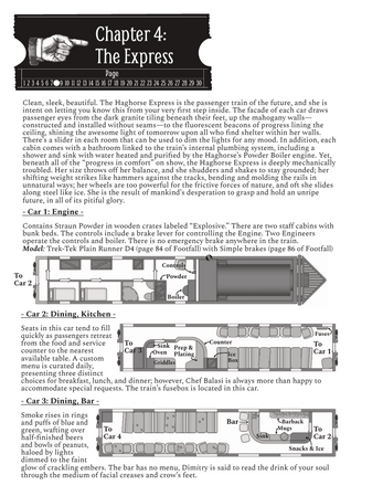 In terms of polish, the version I playtested was pretty full of features but there's been a lot of small stuff added since then. My favorite bit of enrichment for a train scenarios is a period appropriate menu, and Haghorse has one. For maximum immersion, you can try to cook it yourself.