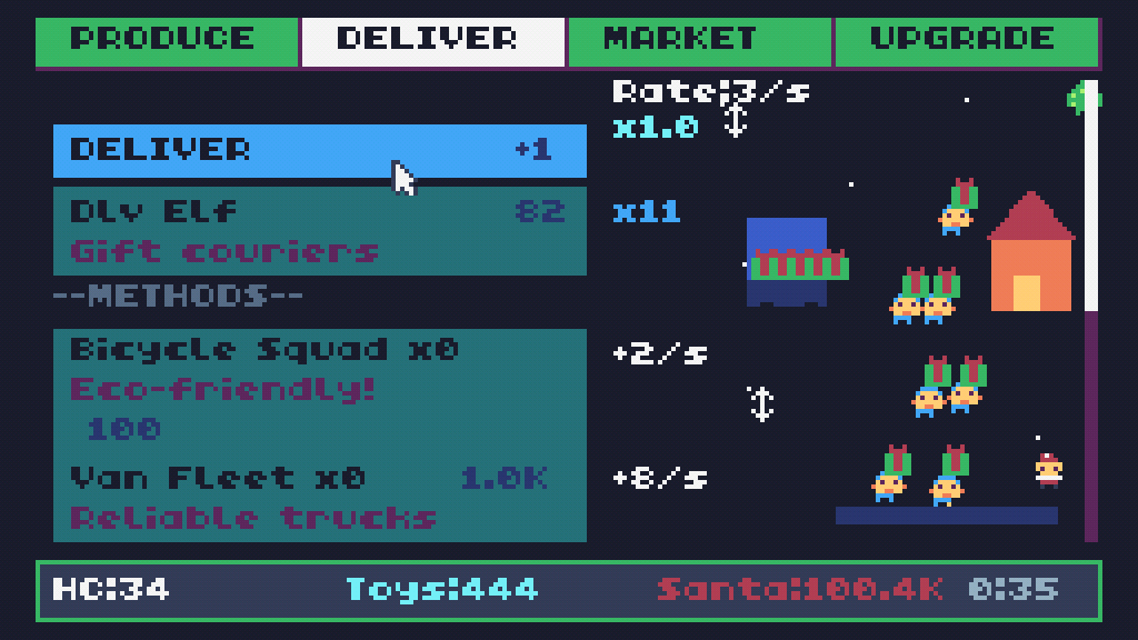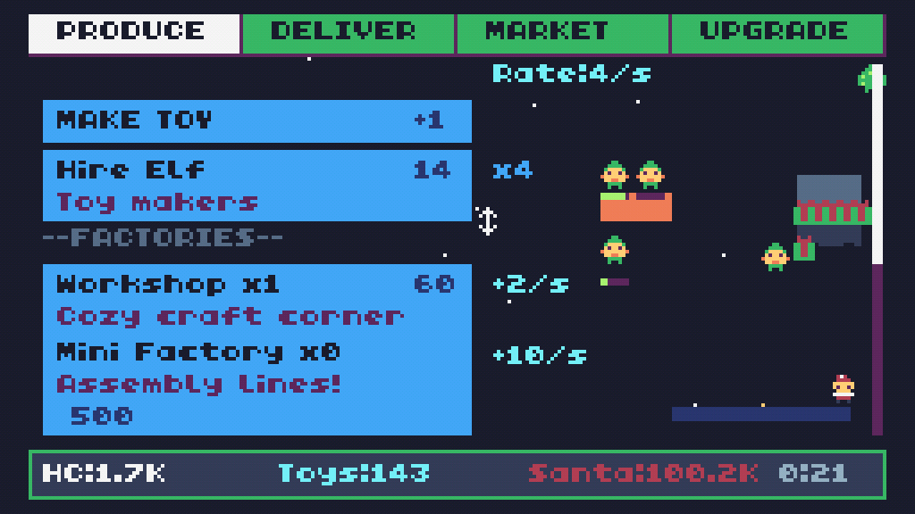 Instructions: Make toys in the produce tab. Then deliver toys in the deliver tab. Your currency is Holiday Cheer (HC), use it to crush Santa's monopoly.