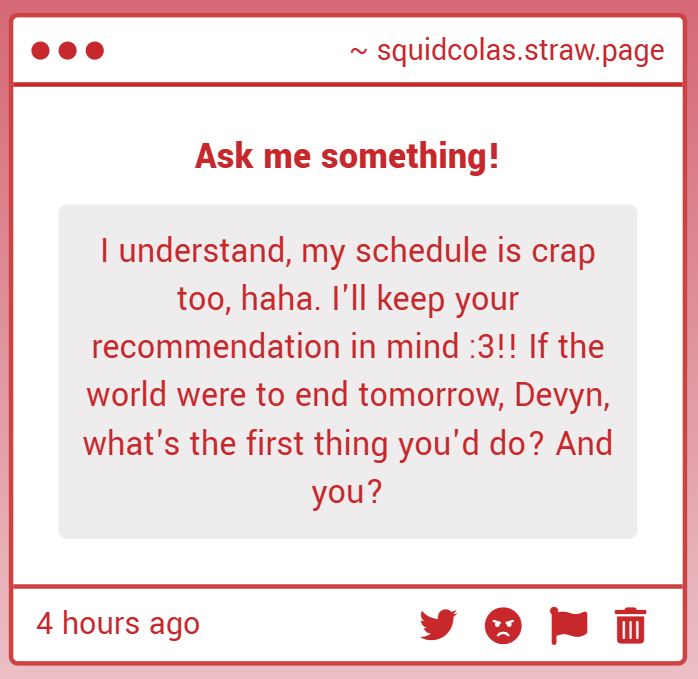 Devyn: If there was anything I could do to protect the one I love from harm, I would make that my first and final priority. If our fate was inevitable, I would make sure they had the greatest last day on Earth and then... well... I'm not quite sure yet.