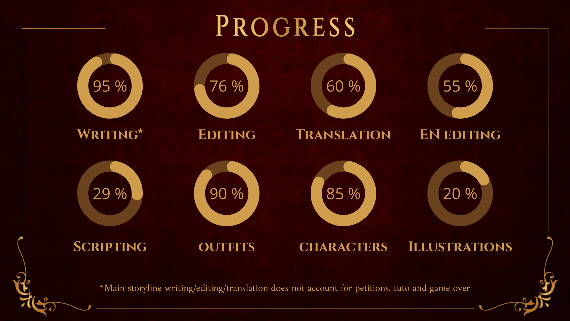 Hello everyone, as promise I am here to give you a quick update about the general advancement of the game. Despite some heavy health problem in the beginning of December the writing is going smoothly, we also have most of our outfits complete, I'm very happy with the current progress for the game!