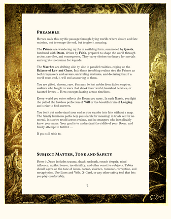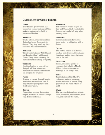 A March can be large as a continent or small as a fortress, but it is a place you live in for some time, not just pass through. The March is the current stage of the story: everything that happens takes place within its bounds until a change occurs. The Primes manifest in a March because it calls for them through summoning, invitation, or omen. A Quest awaits, whether they recognize it immediately or not.