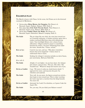 - Guidance for the table: principles for players and the Guide, narrative authority, and how to run the game.
