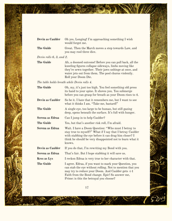 As you seek your own Doom, you still are bound together: not necessarily allies, but entangled. The roads cross. The worlds rhyme. One’s Doom might open a door for another. You don’t know whether you’re destined to help, hinder, or replace each other.