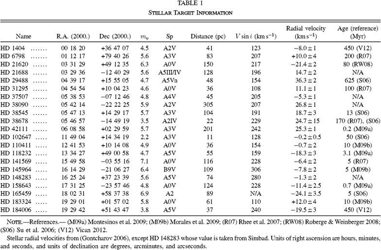To date, the search for exocomets has focused on young (< 50 Myr) A-type stars, which can provide a promising environment for studying young planetary system evolution and may be relatively rich in comet-like debris. An initial survey revealed that one-quarter of all rapidly rotating A-stars are surrounded by circumstellar gas, much of which is confined to disks (Abt et al. 1997). Several subsequent studies have shown that roughly one-third of normal A-type main sequence stars exhibit IR excesses due to debris dust disks (Su et al. 2006; Morales et al. 2011). Although the actual placement of the debris disks is still debated, it seems most likely that dust-production occurs just interior to the snowline (T ∼ 170 –190 K) regardless of the star’s spectral type (B8–M0), which may suggest that at least some of the dust arises from the sublimation of icy bodies (Morales et al. 2011; Su et al. 2013). Moreover, A-type stars likely host planets since radial velocity studies show that they are five times more likely to harbor orbiting Jovian mass bodies than M-type stars (Johnson et al. 2007). We also note that the first successful direct imaging of exoplanets was performed on A-type stars (Marois et al. 2008; Kalas et al. 2008).