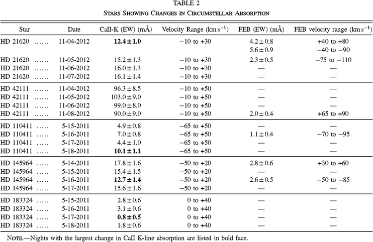 This A0Ve shell star exhibits excess emission at both 24 μ m and 70 μ m, which is characteristic of circumstellar dusty debris disks viewed nearly edge-on (Roberge & Weinberger 2008), and may be emitted by a zone comparable to the Kuiper Belt region (Morales et al. 2009). Our four nights of observations appear in Figure 2 and show that the main CaII K-line absorption is centered at V ∼ +7 km s-1. Observations of the NaI D-line absorption in three stars neighboring HD 21620 (HD 21428, HD 21278, and HD 19279) reveal interstellar absorption centered at V ∼ +5 km s-1 (Genova & Beckman 2003), implying that the main CaII absorption line detected towards HD 21620 (of distance 150 pc) is most likely of interstellar rather than circumstellar origin. Indeed, no significant absorption was detected for HD 21620 at its stellar radial velocity of V ∼ -21.4 ± 2 km s-1. Evidently most of the circumstellar gas has dissipated in this 80 Myr old system (Roberge & Weinberger 2008). Nevertheless, the CaII line profiles shown in Figure 2 reveal significant variability in EW over the four nights’ observations (12.4–16.1 mÅ; see Table 2), which cannot be explained by its space motion through the ISM of only 0.014 AU d-1. Given its mid-infrared excess and edge-on orientation it seems more likely that the observed changes in absorption are due to the evaporation of planetesimals/exocomets that are normally resident in a Kuiper Belt analog and on a grazing approach to the central star.