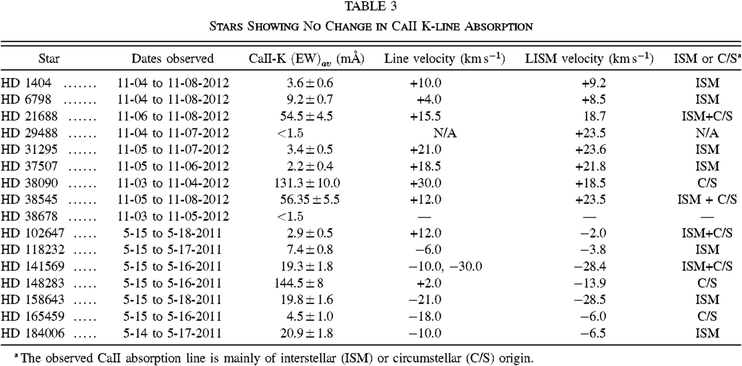 In Table 3 we list the average EW of the CaII K-line profile recorded over several nights for 16 stars that exhibited no measurable absorption variability during our present observations. We also list the central velocity of the CaII line in addition to the projected velocity of the Local Interstellar cloud complex (Redfield & Linsky 2008). Based on the radial velocity of the star shown in Table 1, we then list whether the majority of the absorption is due to the local ISM, its circumstellar envelope, or both. In cases where the observed velocity of the CaII absorption is centered at the radial velocity of the star, then the gas is probably associated with a circumstellar disk. These systems are either too old to possess a circumstellar exocomet harboring dust disk, or they do not show gas absorption variability on time-scales less than several nights of observation.