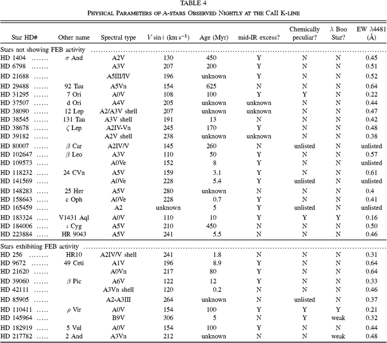 In this table, we consider parameters likely to characterize the two most coherent sets of stars. In the lower half of the table we list the 10 stars that show FEB-activity, as determined by the sporadic appearance of weak absorption features near the CaII K-line that vary in velocity over nightly time-frames. In the upper portion of the table we list stars that show no variability in the main circumstellar CaII K-line in addition to stars that show variability in the EW of the CaII K-line but show no direct evidence of associated FEB activity. We originally suspected that cometary activity would appear to increase with increasing V sin i, increasing amounts of dust as measured by mid-IR excess, and decreasing stellar age. Indeed, our targets were selected based largely on these three criteria. In addition to these parameters in Table 4, we have also included assessments of the stars chemical peculiarity. In column 7, we indicate the stars that Zorec & Royer (2012) listed as CP, and in column 8 we identify the stars that have been called λ Boötis stars. Stars that are identified as weak in Table 4 are those which Abt & Morrell (1995) flagged as exhibiting weak MgII absorption similar to the less-extreme examples of λ Boötis stars. In column 9, we list the equivalent widths of the λ 4481 MgII-absorption line as measured by Abt & Morrell (1995). References to the mid-IR excess measurements can be found in the descriptions of each star given either in this or our previous paper (Montgomery & Welsh 2012).