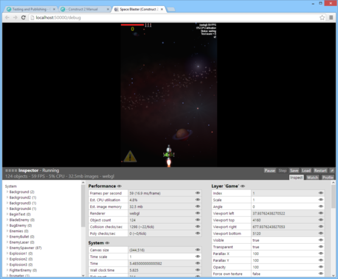 The debugger works much like an ordinary preview, except that an extra panel appears alongside the game in the browser showing lots of information and some useful controls.