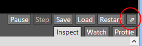 The debugger can also be popped out in to its own window. This is especially useful on multi-monitor setups. The game will show using the full browser window, and a separate browser window displays the debug panel. Click the pop-out button indicated below to do this. Clicking it again, or closing the popup window, will restore it to the main browser window again.