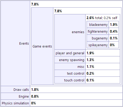 - A breakdown of how much time was spent running event logic in the event sheets used by the layout. This is first broken down in to each event sheet (in case includes were used), and then further down in to groups and nested groups of events. This can help identify the most CPU-intensive events which you may want to optimise.